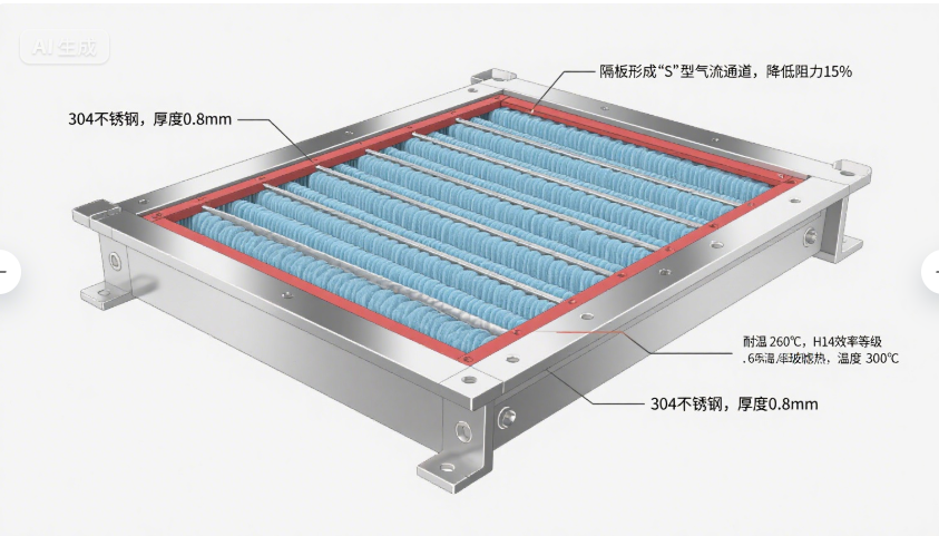 | 结构部件 | 常规HEPA | 耐高温有隔板型 | 性能提升 |
