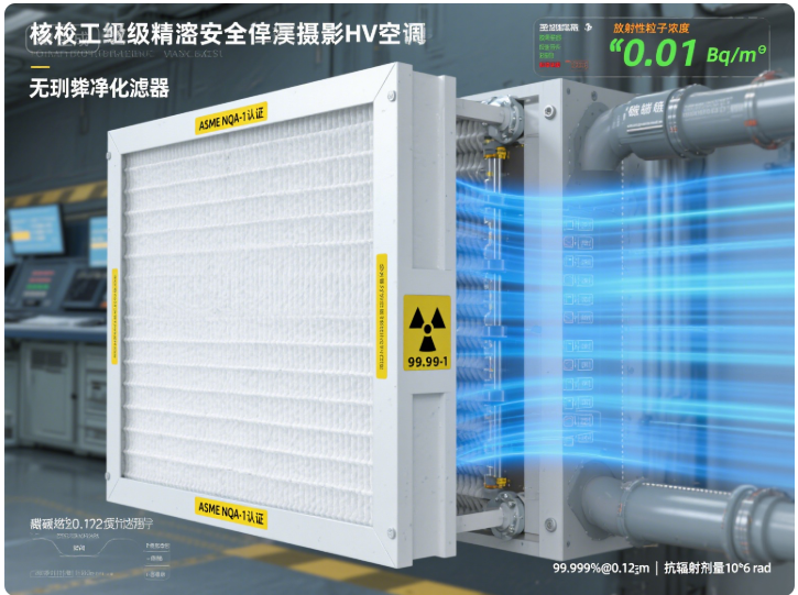 与传统有隔板过滤器相比,无隔板设计通过热熔胶替代金属隔板,消除了气流扰动产生的涡流死角,可更高效捕获放射性气溶胶(如氡子体、裂变产物颗粒)。美国核管理委员会(NRC)的研究数据显示,在同等风量条件下,无隔板高效过滤器对放射性碘气溶胶的去除效率比有隔板设计高 3-5 个百分点,这一微小差异在核事故工况下可能显著降低人员受照剂量。