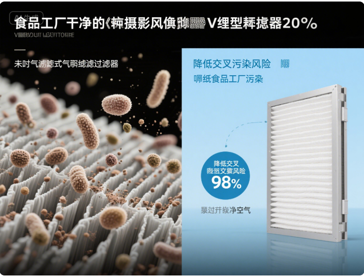 V 型密褶式高效过滤器凭借其大过滤面积、低阻力特性及紧凑结构,在食品加工洁净车间得到广泛应用。与传统有隔板过滤器相比,其无金属框架设计减少了卫生死角,热熔胶密封技术避免了粘胶剂挥发对食品的二次污染,更符合食品工业的卫生要求。美国食品药品监督管理局(FDA)的场地检查指南特别强调,食品暴露区域的空气过滤器应具备易清洁、无脱落物的特性,V 型密褶结构恰好满足这一标准。