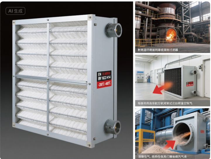 在高温烟气处理、化工反应排气、玻璃熔炉尾气净化等工业场景中,常规高效过滤器面临严峻挑战:持续高温(常达250-400℃)会迅速降解有机滤材与密封材料,热膨胀差异导致结构变形失效,而腐蚀性气体与颗粒物更协同侵蚀过滤系统。耐高温有隔板高效过滤器(High-Temperature Separator HEPA Filter)凭借其独特的金属结构、特种玻璃纤维介质及刚性设计,成为高温、高腐蚀、高粉尘等复杂工业工况下实现亚微米级颗粒高效拦截的核心装备,保障工艺安全、设备寿命与环保合规。