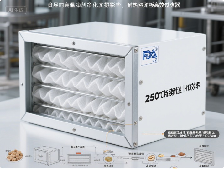食品加工行业对生产环境的洁净度、温湿度控制以及微生物防控有着严格要求。随着消费者对食品安全与品质关注度的提升,以及国际食品标准(如HACCP、ISO 22000、GMP)的广泛实施,食品生产企业不断优化其生产设施,尤其是空气净化系统。在烘焙、干燥、蒸煮、灭菌等高温加工环节中,常规空气过滤器难以承受持续高温,易发生滤料老化、结构变形甚至起火风险,导致净化系统失效。因此,耐高温有隔板高效过滤器(High-Temperature Pleated HEPA Filter with Separator)作为一种专为高温环境设计的空气净化设备,逐渐成为食品加工领域保障空气质量的关键组件。