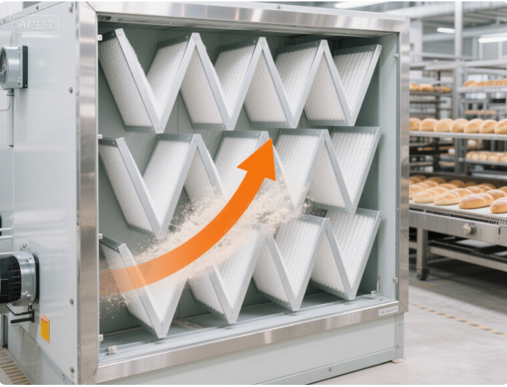 V 型密褶式高效过滤器凭借其大过滤面积、低阻力特性及紧凑结构,在食品加工洁净车间得到广泛应用。与传统有隔板过滤器相比,其无金属框架设计减少了卫生死角,热熔胶密封技术避免了粘胶剂挥发对食品的二次污染,更符合食品工业的卫生要求。美国食品药品监督管理局(FDA)的场地检查指南特别强调,食品暴露区域的空气过滤器应具备易清洁、无脱落物的特性,V 型密褶结构恰好满足这一标准。